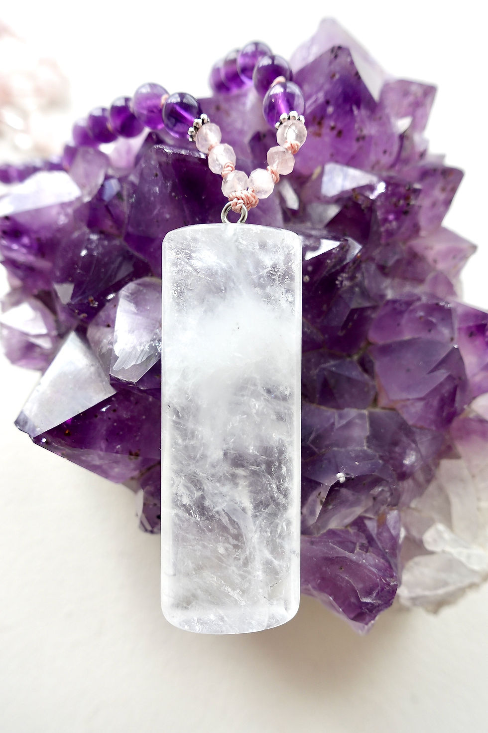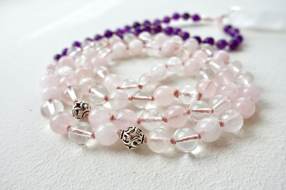 Deze mala is handgeknoopt met 108 edelstenen kralen, samengesteld uit Amethist, Rozekwarts, Bergkristal en twee zilveren kralen. In het hart is de mala verbonden met een Bergkristal hanger. De lengte van de ketting is 90cm (zonder het hangertje)