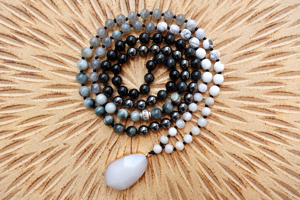 De mala werd handgeknoopt met 108 kwalitatieve edelstenen van 6mm en 8mm: wit Agaat, Howliet, grijze Maansteen, Arendsoog, Hematiet en Regenboogobsidiaan. Deze energetische cirkel bevat één zilveren Tibetaanse mantrakraal en is in het hart verbonden met een hangertje van Braziliaans Wit Agaat.